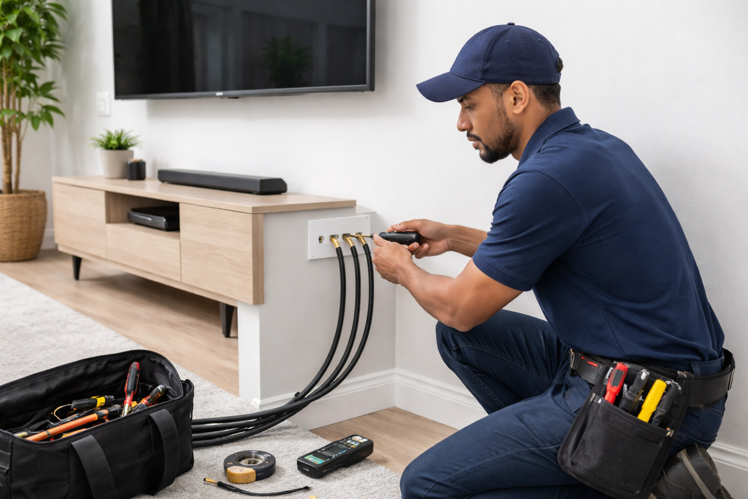 Professionele muurplate met versteekte of netjies gekanaliseerde kabels vir 'n skoon voorkoms.